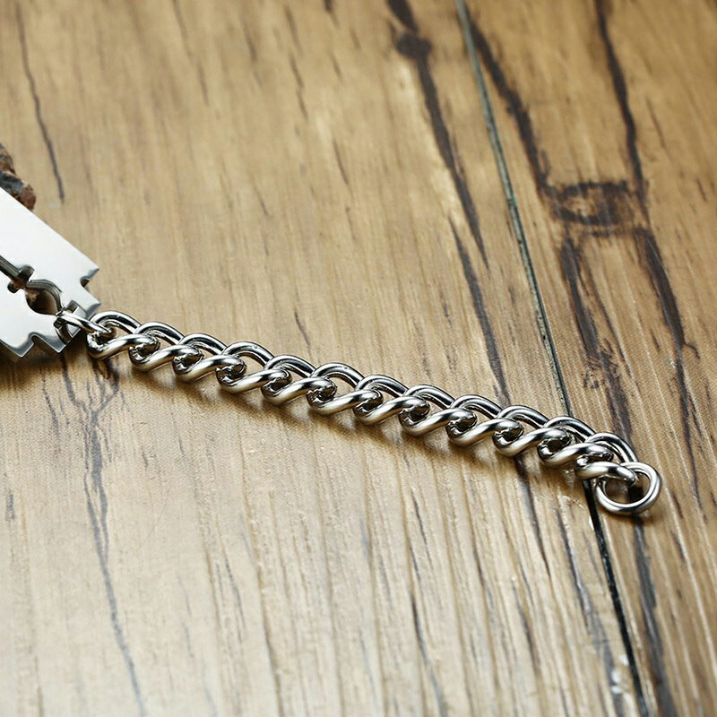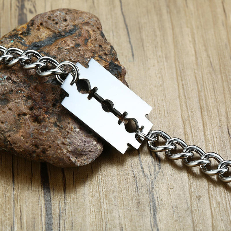 少し太めのステンレスチェーンの真中に剃刀をモチーフにした面白いパーツをセットした遊び心の明日ステンレス製ブレスレット。