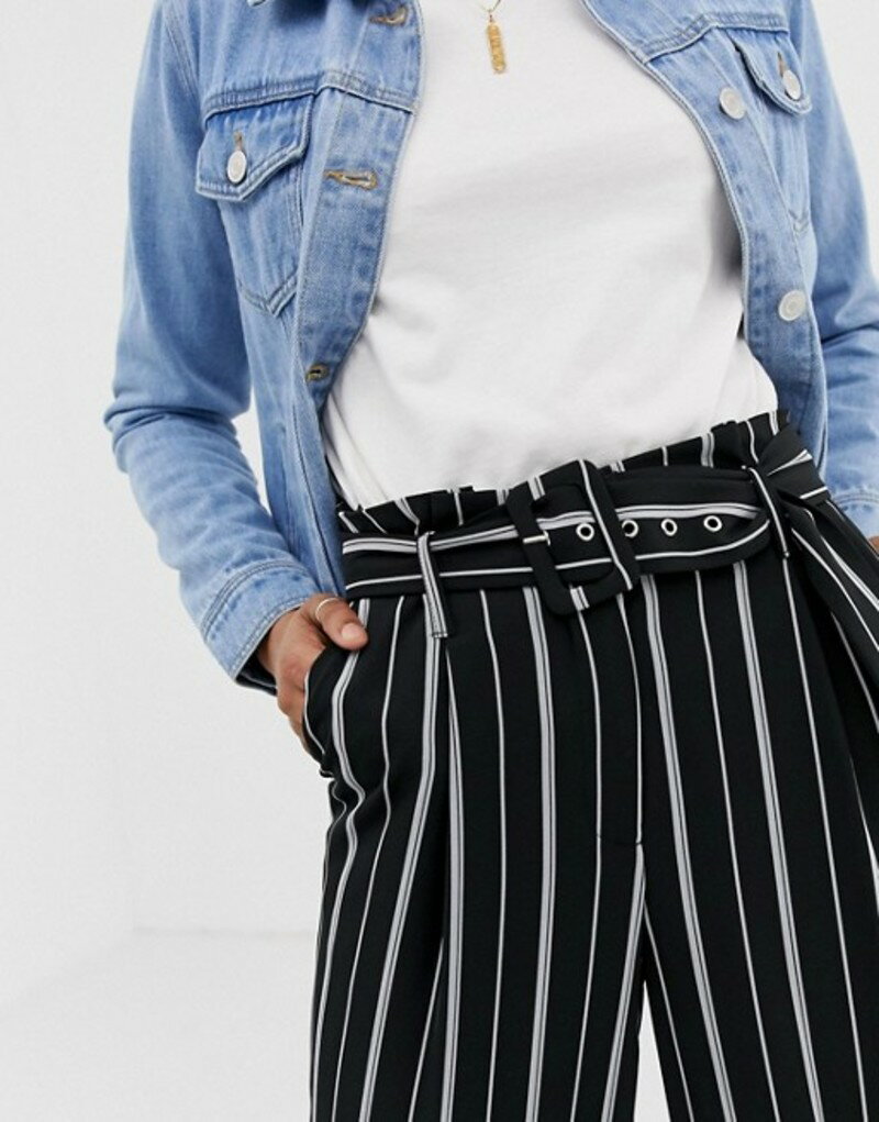 ウエアハウス レディース カジュアルパンツ ボトムス Warehouse wide leg pants with belt in stripe Black and white