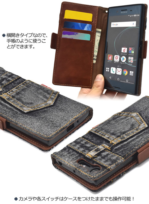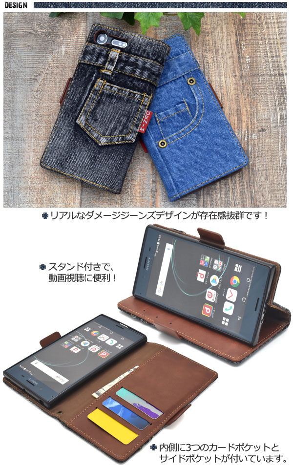 対応機種 Xperia XZ Premium SO-04J 素材 合皮(PUレザー)/TPU/布 サイズ(約) 縦165×横76×厚み21mm 重さ(約) 100g カラー A(ブラック)/B(ブルー)ジーンズデザインの手帳型ケースポーチ。