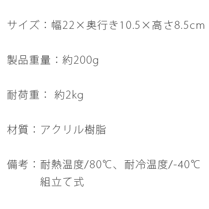 毎日のバスタイムを素敵&快適に演出致します サイズ:幅22×奥行き10.5×高さ8.5cm 製品重量:約200g 材質:アクリル樹脂 耐荷重:約2kg 備考:耐熱温度/80℃、耐冷温度/-40℃、組立て式 カテゴリー:バスグッズ/バスインテリア/バス用品/便利グッズ/ディスペンサー/シャワーホルダー/洗剤入れ/洗剤置き/バスアイテム/白色/黒色/サイズ: 幅22×奥行き10.5×高さ8.5cm 製品重量: 約200g 材質: アクリル樹脂 耐荷重: 約2kg 備考: 耐熱温度/80℃、耐冷温度/-40℃、組立て式